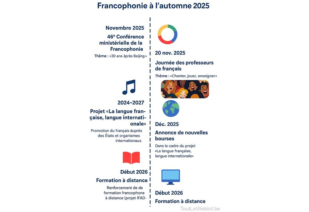 La Communauté Française de Belgique, aussi appelée Fédération Wallonie-Bruxelles, regroupe environ 4,8 millions de francophones vivant surtout en Wallonie et à Bruxelles. Elle est l'héritière de la "Nouvelle Belgique francophone", elle gère principalement des compétences clés comme l’enseignement, la culture et la jeunesse. Active au sein de la Francophonie internationale, elle défend la langue française, soutient l’éducation et promeut également la diversité culturelle dans un État belge multilingue. Son histoire, liée au bilinguisme belge, en fait un acteur clé de la Francophonie. La Communauté Française de Belgique est aussi célèbre pour sa BD, son cinéma et ses festivals de musique.