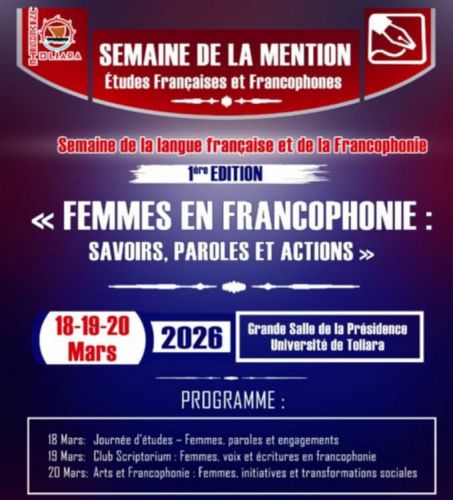 À l’Université de Toliara, la Semaine de la Francophonie (18–20 mars 2026) adopte le thème « Femmes en Francophonie : savoirs, paroles et actions ». Conférences, communications scientifiques, lectures, projections et performances artistiques mettront en lumière la contribution des femmes dans les espaces francophones, en croisant linguistique, littérature, anthropologie et études culturelles. L’événement se veut un espace de réflexion académique majeur, soulignant l’importance croissante des voix féminines dans la recherche et la création.