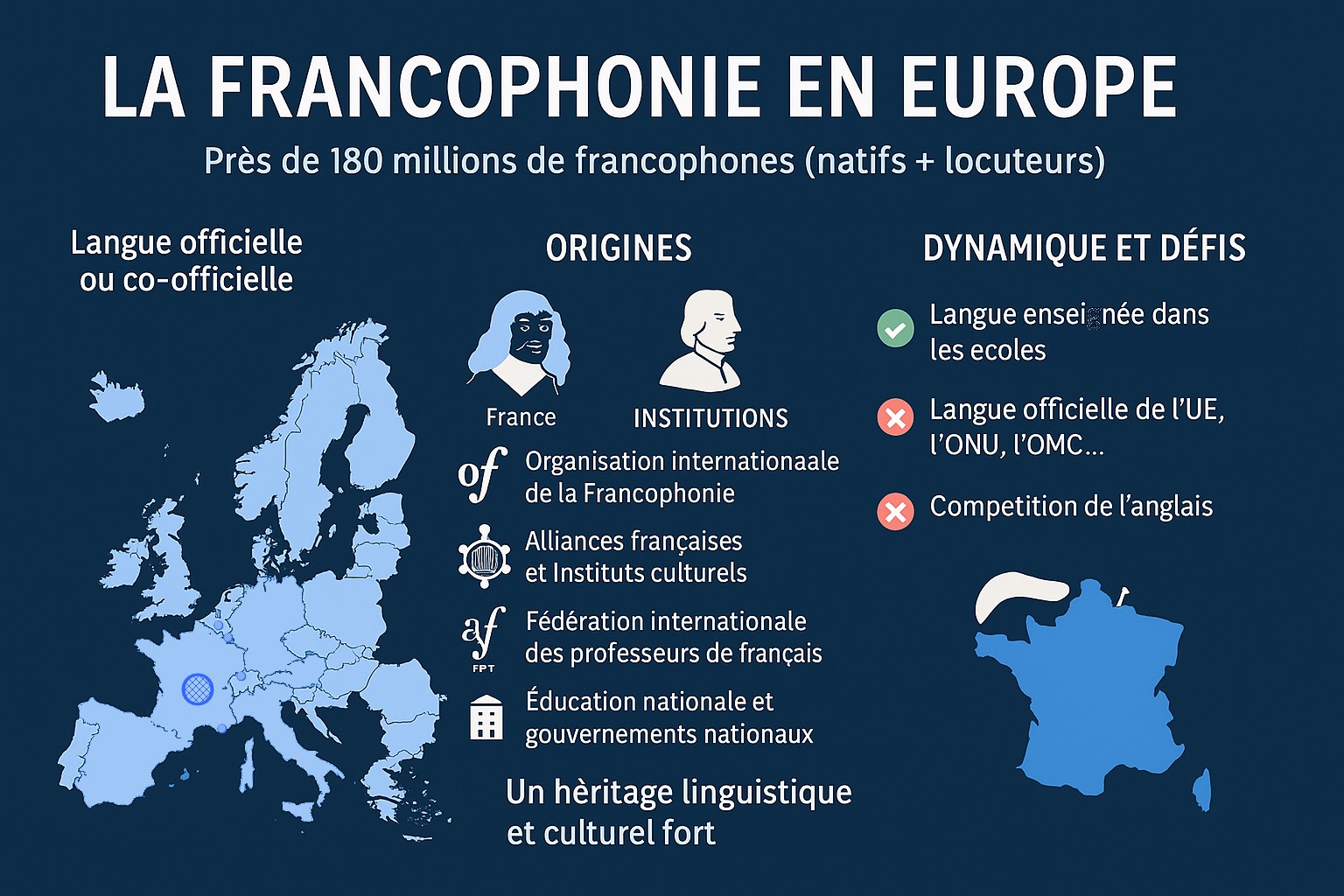 La Communauté Francophone en Europe est importante, historiquement ancrée dans de nombreux pays et régions et institutionnellement bien représenté dans différents pays. Elle est constituée de millions de locuteurs, d'un réseau dense d’institutions éducatives, culturelles et diplomatiques, et a également une présence forte dans les instances européennes; cela démontrent bien que le français reste une langue de référence. Mais les défis sont bien réels — concurrence de l’Anglais, baisse des effectifs scolaires — face ces défis, la francophonie européenne dispose d’atouts considérables : un héritage riche, un engagement institutionnel fort, et une reconnaissance diplomatique significative.
